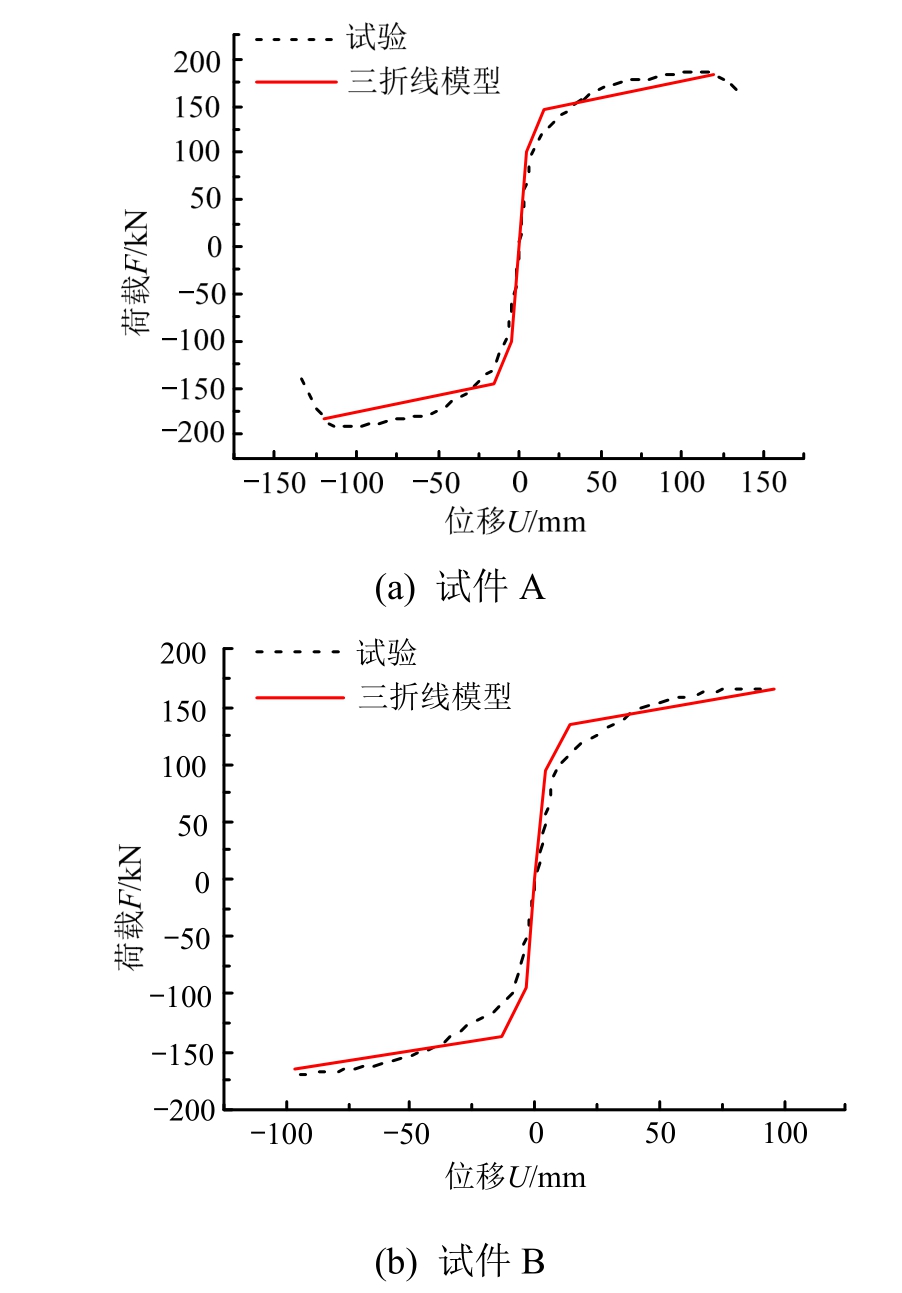 图25 试验骨架曲线与三折线模型曲线对比