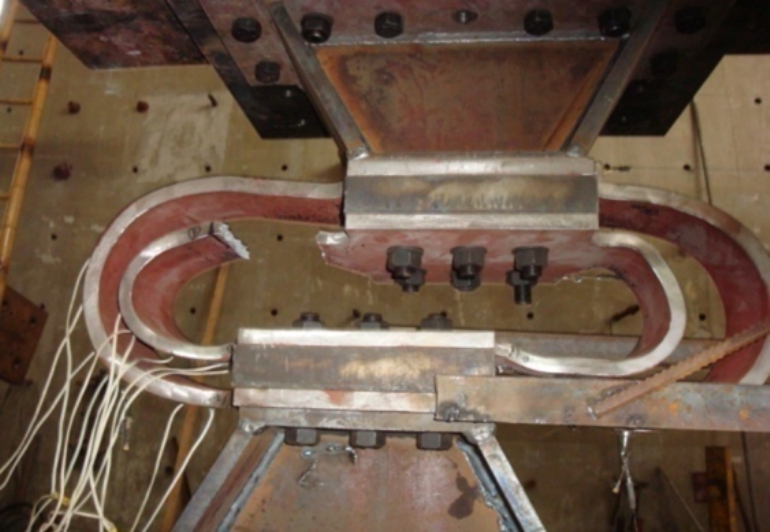 鉴于试件A和B的失效机理和破坏模式基本相同,这里仅对试件A的试验现象予以介绍。当加载位移达到12 mm时,测试系统的电脑屏幕上出现了明显的滞回环,表明内环已开始屈服耗能;当加载至48 mm时,内环正面右下方过渡段出现第一条细微裂缝,如图8所示;当在66 mm位移完成30周疲劳测试之后,内环在下部4个过渡段均出现细微裂缝,但滞回环仍稳定饱满;当位移加载至96 mm时,内环裂缝沿厚度方向已贯通,外环正面右下方过渡段开始出现细微裂缝,如图9所示;当位移加载至 120 mm,内环所有过渡段均出现裂缝,且左上方过渡段附近的裂缝急剧发展,外环下部其余 3个过渡段也出现裂缝,滞回环依旧饱满,承载力也没有明显下降;加载至132 mm时内环左上方过渡段的裂缝贯穿撕裂,如图10所示,试验停止加载。
