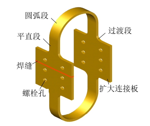 分级屈服型金属阻尼器的示意图如图1所示,主要由同轴内外套设的两个大小不同的环形金属阻尼器(以下简称内环和外环)构成,内、外环之间具有间隔并设有连接垫板。环形金属阻尼器的详细构造如图2所示,包括圆弧段、平直段、过渡段以及中间的扩大连接板,其中圆弧段和平直段为主要耗能段。扩大连接板上开设有螺孔用于和结构构件的预埋件相连,平直段与扩大连接板之间以较大角度光滑过渡以防止产生应力集中。环形金属阻尼器由Q235钢板整体切割弯折成型,只有一条对接焊缝且位于中间扩大连接板内(如图 2所示),在外力作用下呈滚动弯曲变形,屈服点可以不断移动,使得其实现多截面屈服,有效避免屈服点集中出现,能够显著提高其变形性能和抗疲劳性能。
