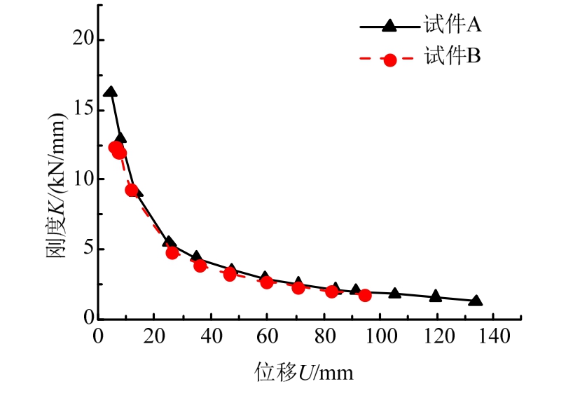 试件 A在 132 mm位移第一圈加载时内环破坏,试件B在96 mm位移第二圈加载时破坏。从图 16可以看出,在内环破坏之前,强度退化率在0.97~1.06,表明分级屈服阻尼器的荷载保持能力较突出。从图17可以看出,两个试件的刚度退化过程基本相似,都是加载初期,刚度急剧退化,加载后期刚度退化趋于平缓,整体刚度退化曲线比较光滑,没有刚度突变,表明两个阻尼器的力学性能稳定、可靠,也可以反映出两个阻尼器的变形能力优越。
