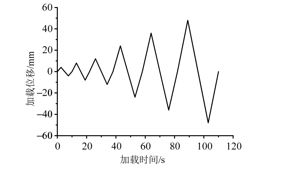 试验采用位移控制加载,第一级和第二级加载位移分别为4 mm、8 mm,每级位移循环加载一次;第三级加载位移从12 mm开始,后续每级加载位移增加12 mm,并在每级位移下循环加载3次,如图7所示。期间,当加载位移增加至试件对应的设计位移(66 mm)时循环加载30周做疲劳性能测试。