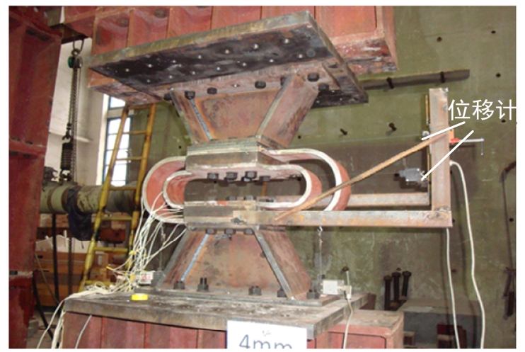 分级屈服型金属阻尼器试验在同济大学土木工程防灾国家重点实验室进行,采用平行四连杆机构对试件进行低周往复加载试验。将阻尼器水平放置,其上部的扩大连接板通过垫梁与平行四连杆机构的上部横梁相连接,下部的扩大连接板通过垫梁与平行四连杆机构的底梁连接。利用SCHENCK液压作动器对上部横梁实施推拉荷载,作动器的位移量程为250 mm。图4所示为阻尼器的位移计布置图。12个应变计设置在内、外环圆弧段的中部、侧部以及平直段的端部三个位置,分别顺着阻尼器加载方向和垂直阻尼器加载方向布置,如图5所示。数据通过DH3817动静态应变测试系统进行采集。现场加载装置如图6所示。