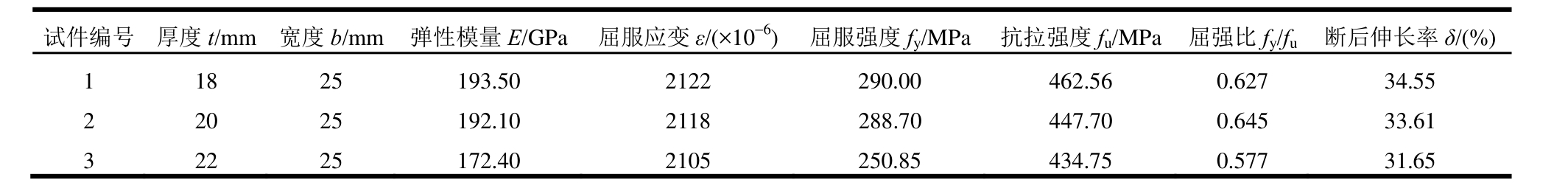 试件编号 厚度t/mm 宽度b/mm 弹性模量E/GPa 屈服应变ε/(×10-6) 屈服强度f y/MPa 抗拉强度f u/MPa 屈强比f y/f u 断后伸长率δ/(%)1 18 25 193.50 2122 290.00 462.56 0.627 34.55 2 20 25 192.10 2118 288.70 447.70 0.645 33.61 3 22 25 172.40 2105 250.85 434.75 0.577 31.65