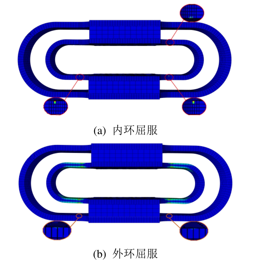 通过调整内、外环的尺寸参数使其具有不同的屈服位移,从而实现小震作用下内环屈服(外环保持弹性状态),中震或大震作用下外环屈服(和内环一起耗能),从而实现分级屈服耗能的设计目标;选择地,也可小震时内外环都处于弹性状态,中震作用下内环屈服(外环保持弹性状态),大震作用下外环屈服(和内环一起耗能)。