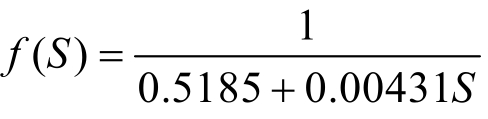 总共建立了19个不同S值的环形金属阻尼器的有限元分析模型(S值在60 mm~160 mm时增幅为10 mm,在 160 mm~200 mm 时增幅为 5 mm),对19个模型进行单调推覆加载分析得到其初始刚度。将每个模型模拟得到的初始刚度除以按初始刚度理论计算公式得到的初始刚度值,对二者之间的比值采用最小二乘法回归拟合得到环形金属阻尼器的初始刚度的修正系数f(S),回归拟合曲线见图23。