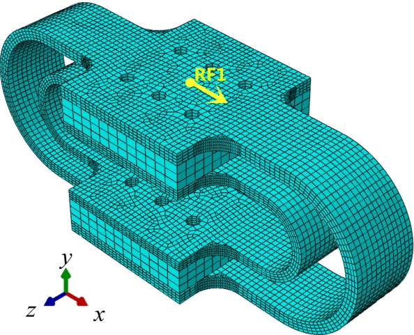 基于 ABAQUS有限元分析程序,采用ABAQUS/Standard分析模块,所有构件的单元均为8结点线性六面体减缩积分实体单元(C3D8R),应用扫掠化分网技术并采用进阶算法进行网格划分。分级屈服型金属阻尼器中垫板与内、外环通过 Tie命令进行绑定,试件下部的扩大连接板完全固定,上部的扩大连接板定向约束,只释放x向平动自由度。上连接板与一个参考点RF1耦合,采用位移加载方式,向参考点RF1施加x方向的逐级递增的循环位移,加载时程与试验相同。Q235钢材采用双线性随动强化模型,试件的有限元模型如图 19所示。