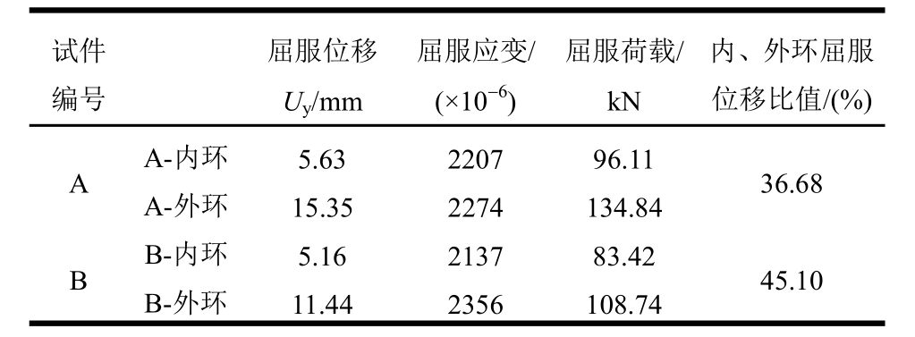 试件编号 屈服位移U y/mm屈服应变/(×10-6)屈服荷载/kN内、外环屈服位移比值/(%)A A-内环 5.63 2207 96.11 36.68 A-外环 15.35 2274 134.84 B B-内环 5.16 2137 83.42 45.10 B-外环 11.44 2356 108.74