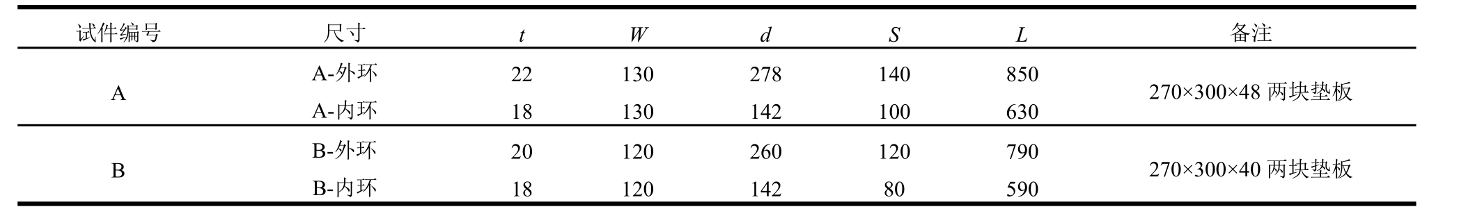 试件编号 尺寸 t W d S L 备注A A-外环 22 130 278 140 850 270×300×48 两块垫板A-内环 18 130 142 100 630 B B-外环 20 120 260 120 790 270×300×40 两块垫板B-内环 18 120 142 80 590