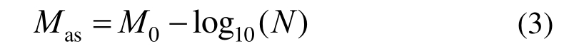 根据式(2),若取N=2,可得:M as=M0-0.3010;若取N=3,可得:M as=M0-0.4771。上述结果表明:对于震级大于或等于 M 0的主震,根据Gutenberg-Richter定律,将会有 2次 M as≥M0-0.3010的余震或者3次M as≥M 0-0.4771的余震发生。本文仅考虑N=2次余震的情况。