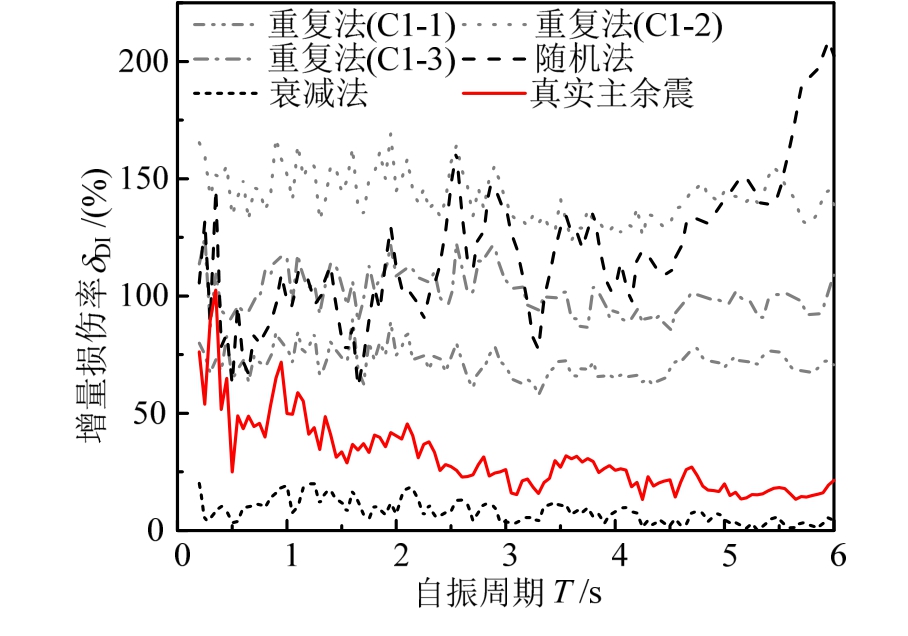 由图 11可以看出:基于重复法和随机法构造的人工主余震序列所造成的余震增量损伤要高于真实主余震序列作用下的结构增量损伤值,而基于衰减法构造的人工主余震序列造成的增量损伤则要低于真实主余震序列造成的增量损伤。具体而言,当结构周期位于3 s~6 s之间时,真实主余震序列所造成的平均增量损伤率大致在 20%~40%;基于重复法构造的人工主余震序列所造成的平均增量损伤率在55%~100%之间;基于随机法构造的人工主余震序列所造成的增量损伤率则高达70%~100%;而基于衰减法构造的主余震序列所造成的增量损伤率却不足15%。
