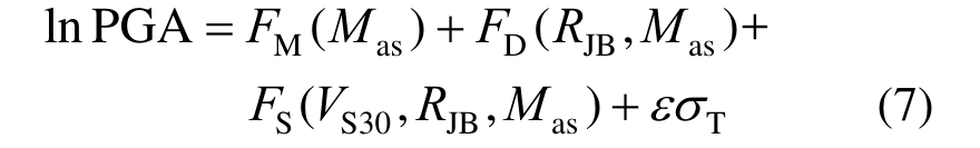 式中:F M、F D、F S分别代表震级调幅函数、距离函数和场地放大效应函数;R JB表示 Joyner-Boore断层距;σT表示待预测值与均值预测值之间相差的标准差的倍数。本文未考虑σT,即所取得的 PGA预测值为平均值。
