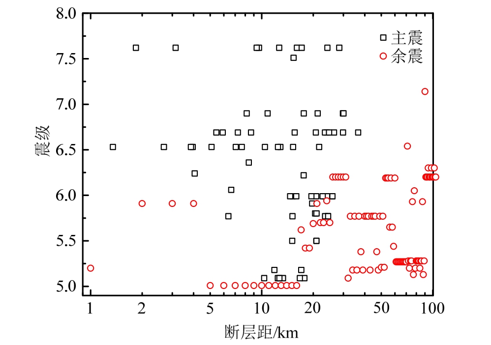 上述 75条主余震地震动记录的震级和断层距关系,如图1所示。由图可知,相比于主震,余震的震级明显减小,断层距显著增大。