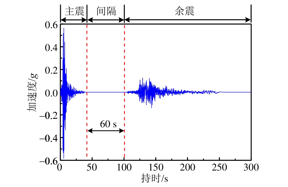 图 2给出了一条真实主余震序列的地震动时程。由图可见,主震记录和余震记录之间加入了60 s的时间间隔。这一时间间隔将使得结构在主震作用后的惯性振动充分耗散,回到一个新的平衡位置。