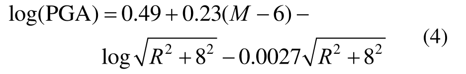 已知余震震级,进一步采用广为采用的Joyner-Boore地震动预测模型来确定余震的PGA强度: