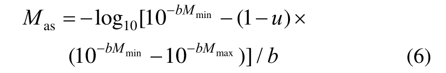式中:余震最小震级为 M min=5.0;余震最大震级M max取为主震震级;u是服从标准均匀分布的随机数;b是常数,取为b=0.97。