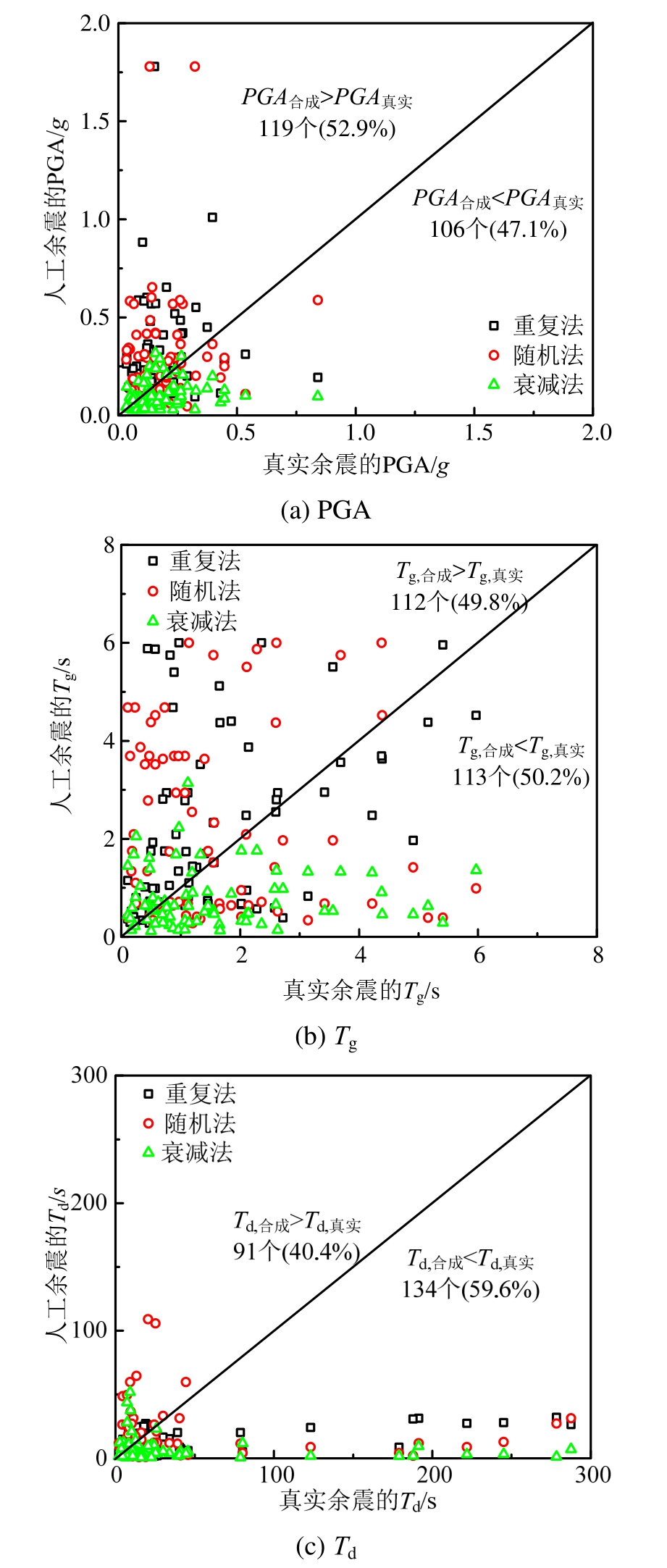 图 4(a)~图 4(c)分别给出为不同合成方法构造的人工余震与真实余震的PGA、T g、T d的比值分布图。图中,对角线上方数据点表示人工余震的地震动参数大于真实余震的地震动参数,对角线下方的点表示人工余震的地震动参数小于真实余震的地震动参数。