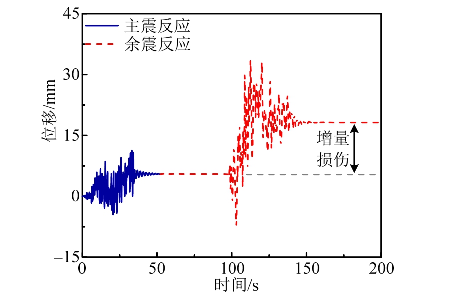 图8 主余震序列作用下的结构位移反应及增量损伤