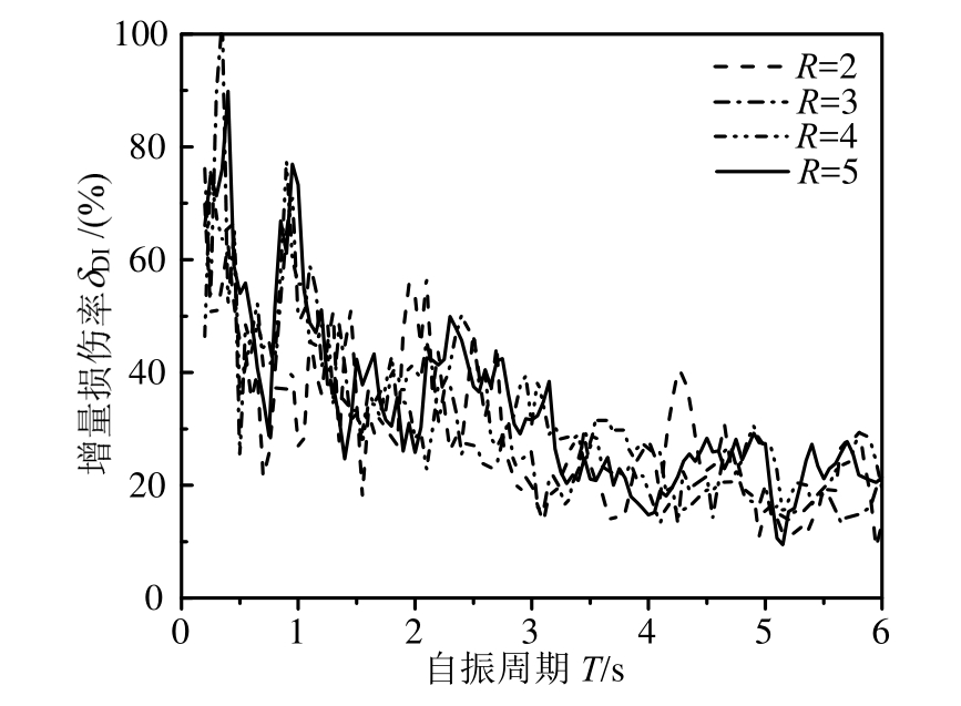 以Model-1为基本模型,考虑不同强度折减系数R的影响(R=2~R=5),以75条真实主余震序列作为输入,获得真实主余震序列作用下的增量损伤谱,并进一步计算得到增量损伤谱的中位值,如图9所示。由图可知,随着周期的增大,中位值增量损伤指数逐渐减小,但局部波动剧烈,无明显规律性。此外,不同强度折减系数对应的结构增量损伤谱较接近,表明:在主余震序列作用下,结构强度折减系数对非线性SDOF体系的增量损伤影响程度较小。