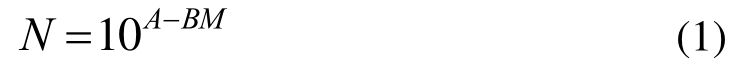 式中:M为震级;N为发生大于或等于M级地震的次数;A和B是常数。若取B=1.0,并对式(1)两边取对数,可得: