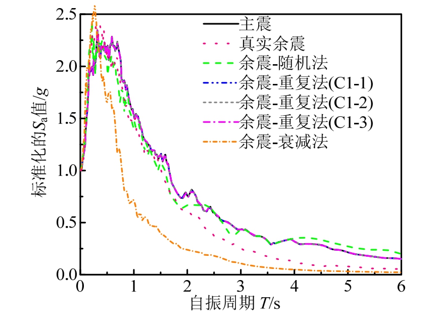为进一步分析人工余震与真实余震的反应谱特征,图5给出了阻尼比为5%时,75条主震和75条人工余震及 75条真实余震的归一化加速度反应谱的中位值。对一条给定的地震动记录,归一化的加速度反应谱是先对地震动记录除以该地震动记录的 PGA以实现标准化,再对标准化的地震动记录进行反应谱分析。由图5可以看出,真实余震的谱加速度小于主震的谱加速度。此外,基于重复法的人工余震反应谱中位值和主震反应谱中位值几乎重合;基于随机法的人工余震反应谱中位值略小于主震反应谱中位值,但相比真实余震反应谱中位值略大。此外,在长周期4 s~6 s区间内,基于随机法的人工余震反应谱中位值超过主震反应谱中位值。基于衰减法的人工余震反应谱的中位值,在结构周期为 0.5 s以内时略高于真实余震及主震的反应谱中位值,而在结构周期大于0.5 s后则大幅度低于真实余震。综上可知,基于重复法和随机法的人工主余震序列高估了余震的强度,而基于衰减法的人工主余震序列则低估了余震的强度。