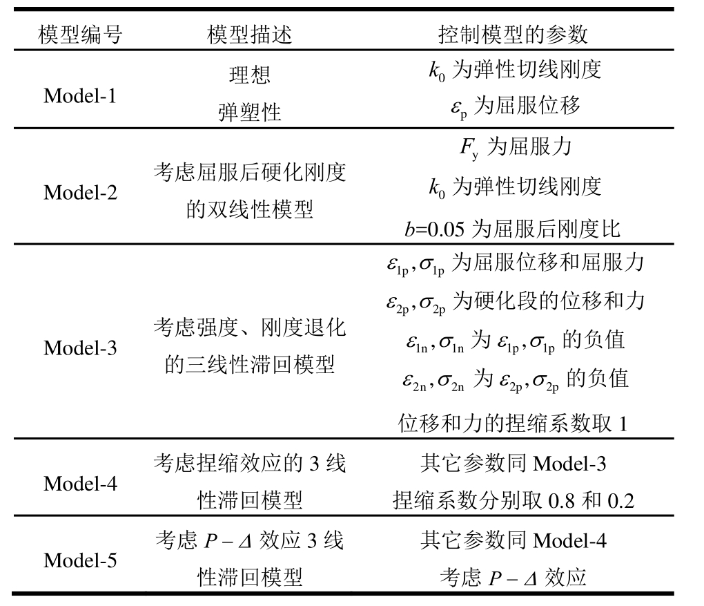 模型编号 模型描述 控制模型的参数Model-1 理想弹塑性0 k为弹性切线刚度pε为屈服位移Model-2 考虑屈服后硬化刚度的双线性模型y F为屈服力0 k为弹性切线刚度b=0.05为屈服后刚度比Model-3 考虑强度、刚度退化的三线性滞回模型1p 1p,ε σ 为屈服位移和屈服力2p 2p,ε σ 为硬化段的位移和力1n 1n,εσ为1p 1p,εσ的负值2n 2n,εσ为2p 2p,εσ的负值位移和力的捏缩系数取1 Model-4 考虑捏缩效应的3线性滞回模型其它参数同Model-3捏缩系数分别取0.8和0.2 Model-5 考虑PΔ-效应3线性滞回模型其它参数同Model-4考虑PΔ-效应
