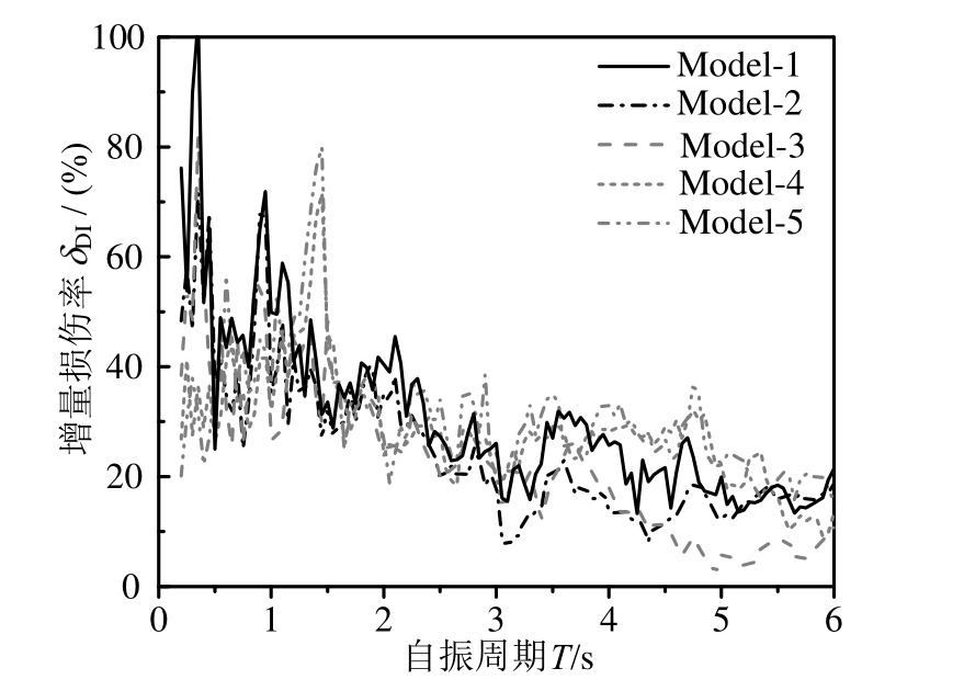 由图 10可知,不同的恢复力模型所对应的增量损伤中位值谱变化趋势的在整体上基本保持一致。这一结果说明:恢复力模型对结构增量损伤的影响较小。在短周期内(T<1 s),相比于其他恢复力模型,理想弹塑性模型(Model-1)受余震的影响最大,该模型所对应的增量损伤也较大。Model-3、Model-4和Model-5所对应的增量损伤曲线基本一致,这说明在非线性SDOF体系建模中,模型的退化、捏拢和 P-Δ效应对其在主余震序列作用下的增量损伤影响并不明显。