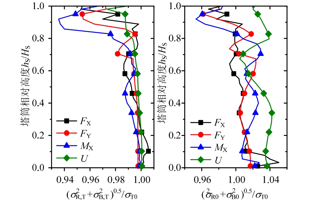 可以看出,尽管σR对σT的贡献随位置和响应而变化,但各响应的σT均以σB为主,尤以 F X和 F Y的最为明显,M X的σR贡献在各响应中相对最大:文献[1]对此有详细故不再赘述。另外,σR与σB之间的耦合分量可以忽略[1]:如以σB,T和σR,T采用式(7)计算,则所得结果与σT0的偏差仅在-7%~1%以内,并且偏差主要出现在塔顶区域;即使采用σB,0和σR,0采用式(7)计算,所得偏差也仅在-5%~5%以内(图5)。