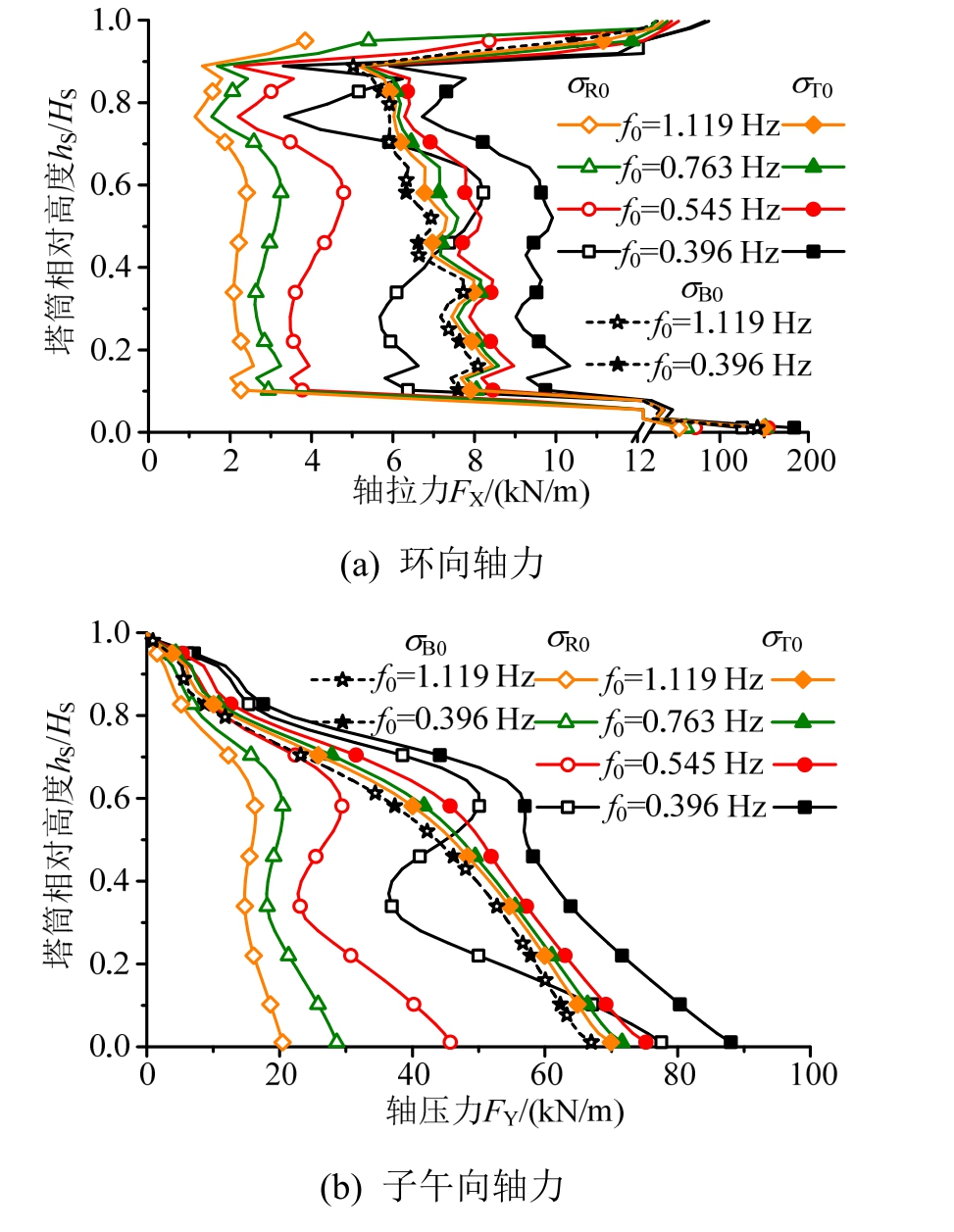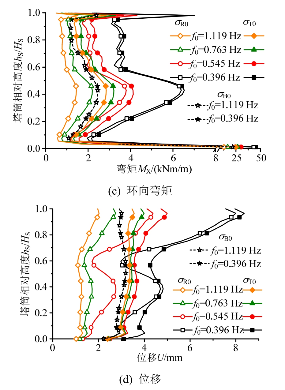 值得注意的是,除塔筒顶端位移U外,各响应的σB0和σB,T均相等,说明σB0和σT0的位置重合,对σB和σT的环向分布分析也印证了这一点,这实际上也是因为σB在σT中占绝对主要成分,故σT0出现在σB0位置。另一方面,σR0和σR,T的位置并不重合,但两者数值相差不大,尤其对于三个内力。故下文仅以σB0、σR0和σT0为对象分析各自随基频的变化。