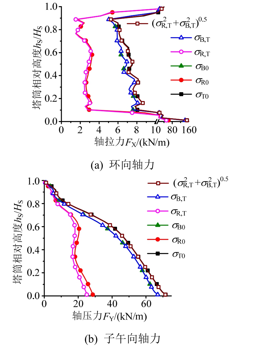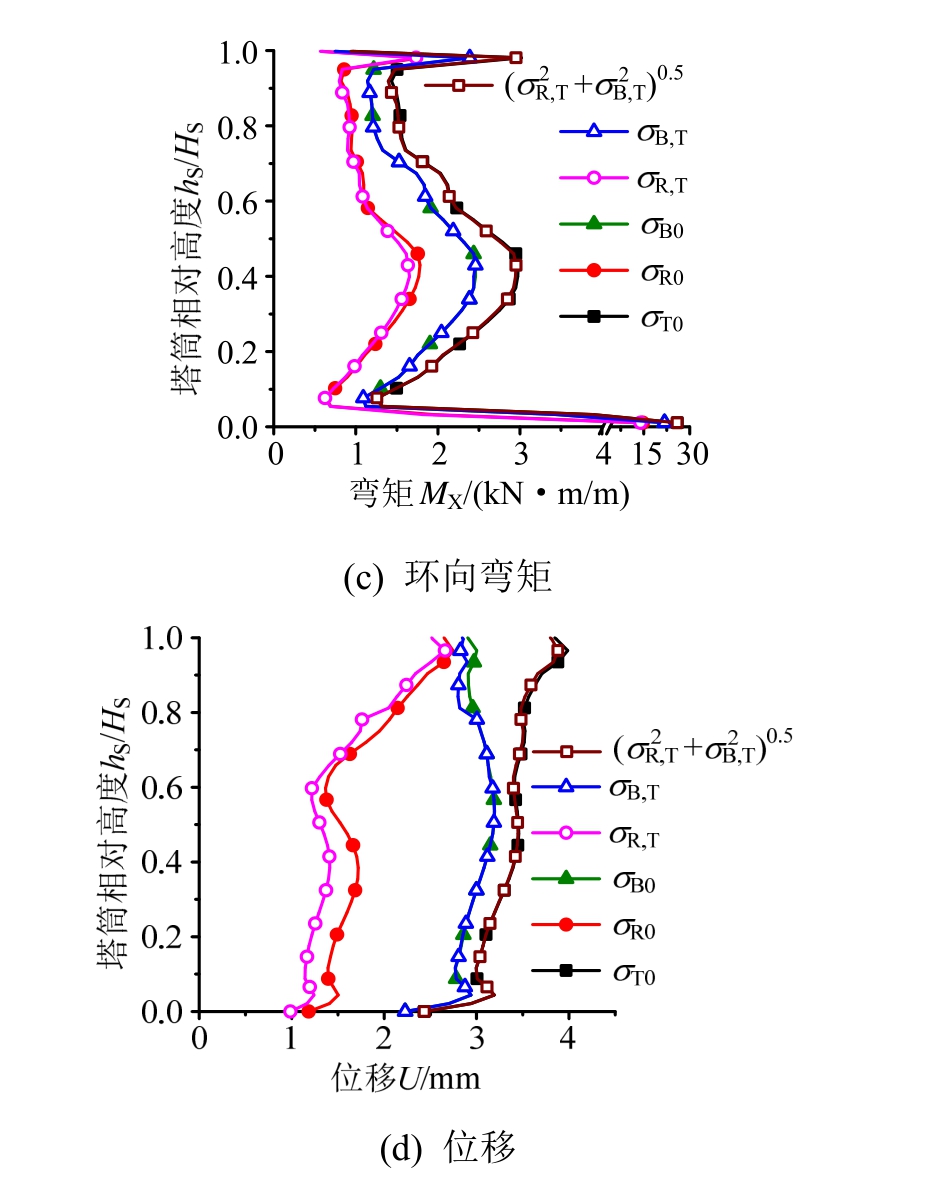 为便于下文对比,图4还给出了各内力和位移的背景分量σB0和共振分量σR0,与总脉动分量σT0类似,两者同样为整个断面的最大值,同时还给出了σT0位置对应的共振和背景分量并用σB,T和σR,T表示。需要说明,本文σT直接来自动力时程计算,σB则来自不计入惯性效应的时程计算,上述两个时程结果的差值即为共振响应时程,从而可得σR:计算方法详见文献[1]。