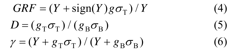 需要说明,图4(c)的GRF为响应极值与均值的比值(式(4)),也即 Davenport方法[15]。而文献[5]对式(4)所示比值称为动力放大系数D,但这一称谓并不合适:因为动力放大系数的概念源于经典的动力学教材[16],由于动力分析所施加荷载是零均值的,故其表达式为总脉动响应幅值与背景响应幅值的比值,可粗略表示为式(5),实质为共振效应或者说惯性效应权重的体现。另外,如果对式(5)计及均值响应则有式(6),这也是德国冷却塔设计规范[17]所采用的形式,并称之为共振因子γ。可见,不同文献对风荷载脉动效应的表达并不一致,参阅时需要注意。