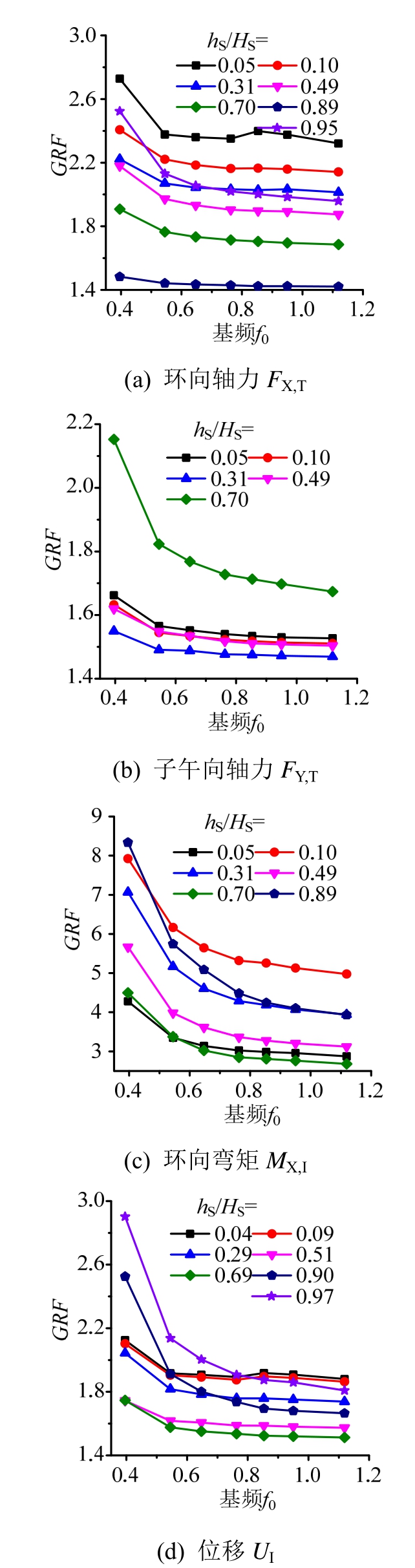 阵风响应因子GRF作为风振效应的最终表达,图8给出了其随基频f0的变化,并且环向弯矩M X和位移U各自的两个代表值,M X,O和M X,I以及U O和U I,的GRF随f0的变化几乎一致,故仅给出M X,I和U O的GRF,这两个GRF也分别是相对较大的。可以看出,在f0>0.6 Hz时,只有M X的GRF随f0的降低而有所增加,其他响应的 GRF基本不随 f0变化;在f0<0.6 Hz时,各响应的GRF都随f0的降低而有所增加,在f0<0.5 Hz后则随f0的降低而急速增加:这些都可以从图 6所示 f0对各响应σR和σT的影响规律得以解释。综合表1所列不同高度冷却塔的基频f0和图8所示GRF随f0的变化可知,对于现阶段即使215 m高的冷却塔,其阵风响应因子受结构f0的影响可以忽略,但如果未来冷却塔高度持续增加而使 f0进一步下降,则须考虑 f0对 GRF的影响。