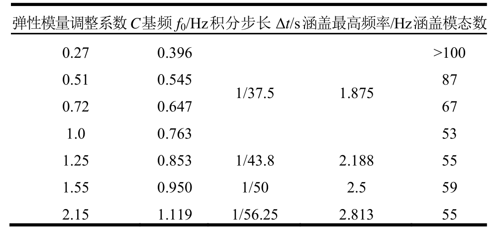 弹性模量调整系数C基频f0/Hz积分步长Δt/s 涵盖最高频率/Hz涵盖模态数0.27 0.396 1/37.5 1.875>100 0.51 0.545 87 0.72 0.647 67 1.0 0.763 53 1.25 0.853 1/43.8 2.188 55 1.55 0.950 1/50 2.5 59 2.15 1.119 1/56.25 2.813 55