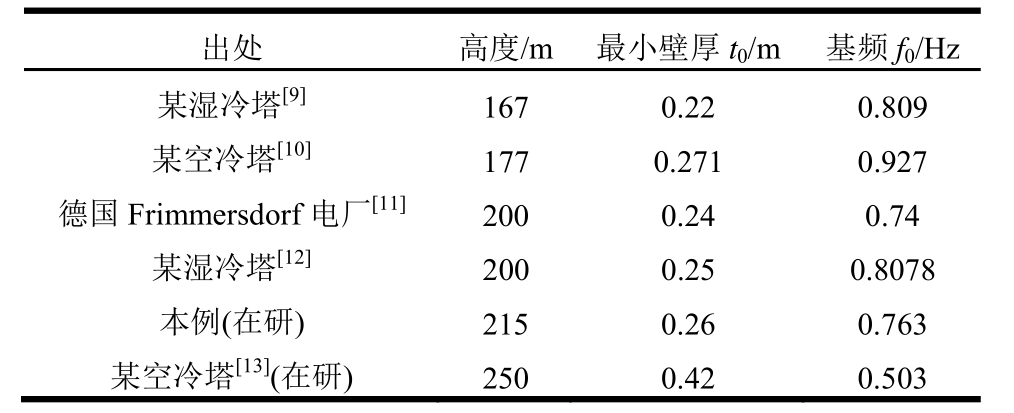 出处 高度/m 最小壁厚t0/m 基频f0/Hz某湿冷塔[9] 167 0.22 0.809某空冷塔[10] 177 0.271 0.927德国Frimmersdorf电厂[11] 200 0.24 0.74某湿冷塔[12] 200 0.25 0.8078本例(在研) 215 0.26 0.763某空冷塔[13](在研) 250 0.42 0.503