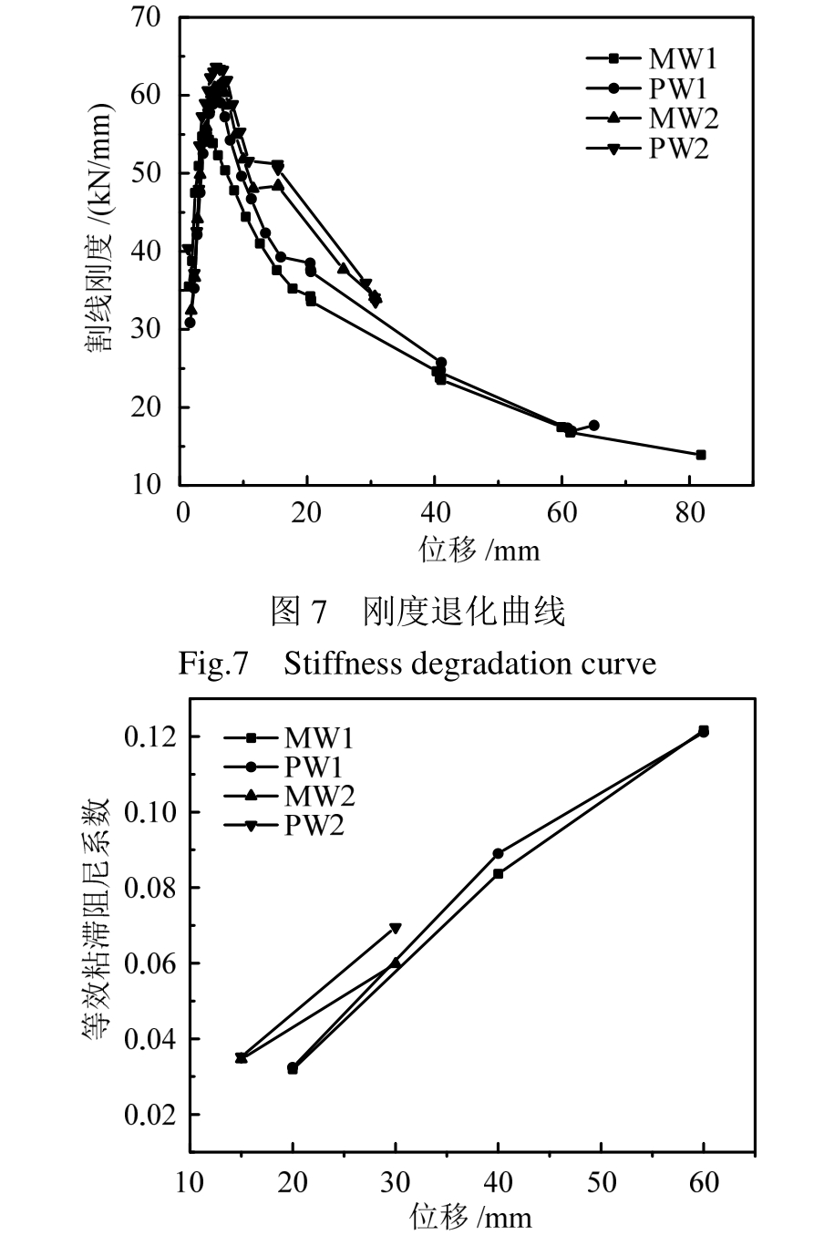 整个加载过程中,各试件的割线刚度变化情况见图 7。在相同轴压比条件下的试件表现相当,尤其是弹塑性阶段刚度曲线基本接近,在加载初期,由于加载荷载或位移相对较小,受试件与试验设备间的间隙影响较大,尤其对于轴压比较小的试件MW 1、PW 1,曲线初期相对有所离散。