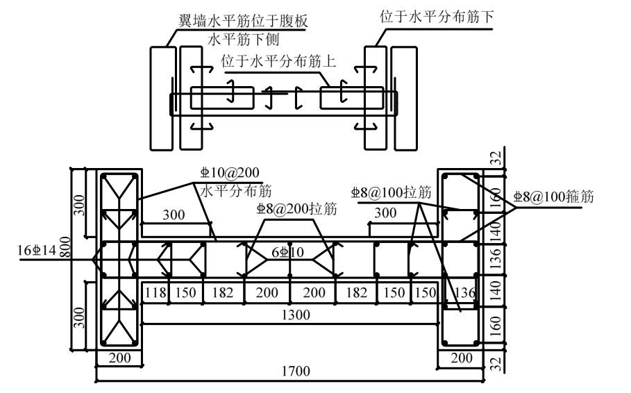 试件几何尺寸见图 1,现浇试件配筋见图 2,装配式试件配筋见图 3。对于装配式试件,水平接缝位于预制墙与底座交接处,预制剪力墙与底座之间设置20 mm厚坐浆层,剪力墙竖向钢筋采用金属波纹管浆锚连接,选用φ40金属波纹管,波纹管直线段长(即钢筋浆锚长度)600 mm,灌注无收缩、高强度灌浆料;竖向接缝的现浇带设置在剪力墙腹板两端300 mm范围内,竖向钢筋采用通常钢筋,并预埋于底座,腹板水平钢筋锚固于现浇混凝土内;预制部分与现浇部分剪力墙边缘构件箍筋采用扣接封闭箍筋。