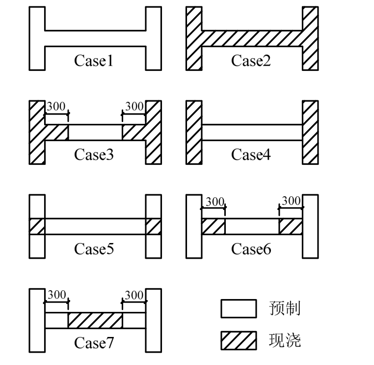 为探讨现浇带的具体设置对水平接缝受力性能的影响,基于试件几何尺寸,补充分析几种典型现浇带设置情况(见图 13,包括 Case1:全预制;Case2:全现浇;Case3:边缘构件全现浇;Case4:翼缘全现浇;Case5:交角处现浇;Case6:腹板端部现浇,即试验试件;Case7:腹板全现浇)模型的单调荷载-位移曲线。