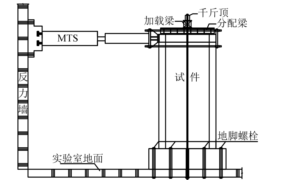 试件加载装置示意图见图 4。试件通过预应力精轧螺纹钢形成的地脚螺杆与试验室地面锚固连接;通过拉杆与1000 kN电液伺服作动器(MTS)进行连接以施加水平反复荷载;通过体外索、横向加载梁及纵向分配梁施加竖向荷载。
