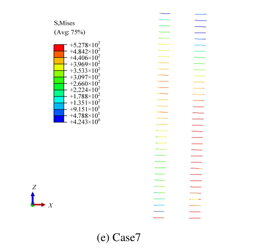 竖向接缝现浇带内水平钢筋构造要求及受力连续性问题一直受到广泛关注,将各模型穿越现浇带与预制混凝土的水平钢筋或扣接封闭箍筋在峰值水平位移荷载作用下的应力云图示于图 17,其中,全预制情况(Case1)与全现浇情况(Case2)不存在该问题,因此,未给出相应云图。从图中更可以看出,对于边缘构件全现浇情况(Case3),剪力墙水平分布钢筋作为现浇带与预制混凝土界面的连接钢筋,其主要在腹板区域屈服,以提供墙体抗剪承载力;对于翼缘全现浇情况(Case4)和交角处现浇情况(Case5),边缘构件的扣接封闭箍筋作为连接钢筋,主要在剪力墙弹塑性变形段发生屈服,主要为提供对混凝土的约束,其对墙体抗剪承载力贡献较小;对于腹板端部现浇情况(Case6)和腹板全现浇情况(Case7),由于现浇带设在腹板,作为连接钢筋的扣接封闭箍筋在剪力墙大半高度上均发生屈服,其对墙体抗剪承载力有一定贡献。因此,对于现浇带内水平钢筋连接构造,宜根据其现浇带位置及钢筋应力情况确定,当其参与墙体抗剪时,应采取可靠措施保证其锚固;但建议不考虑连接钢筋的抗剪承载力贡献,使其受力简单且可简化构造。