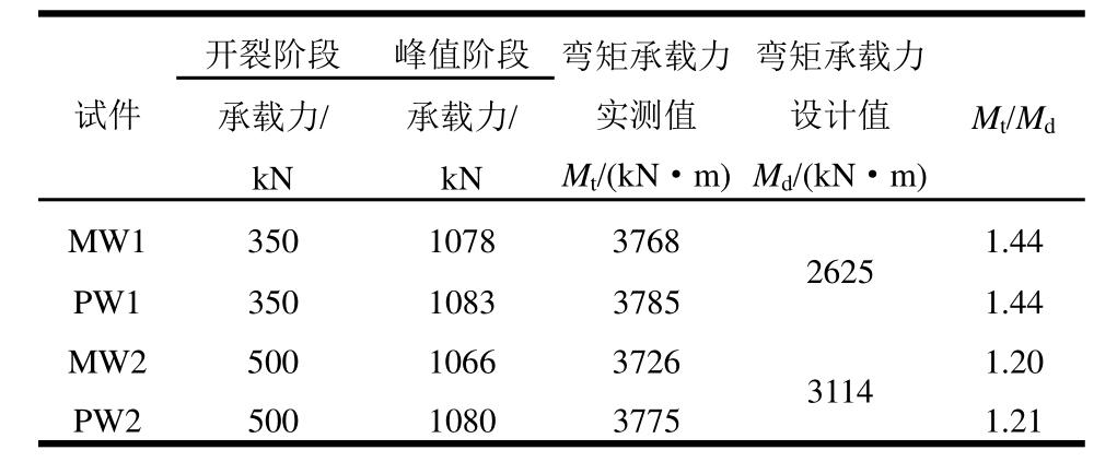 试件开裂阶段 峰值阶段 弯矩承载力实测值M t/(kN·m)弯矩承载力设计值M d/(kN·m)M t/M d承载力/kN承载力/kN MW 1 350 1078 3768 2625 1.44 PW 1 350 1083 3785 1.44 MW 2 500 1066 3726 3114 1.20 PW 2 500 1080 3775 1.21