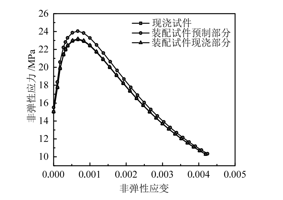 混凝土本构采用程序自带混凝土损伤塑性模型[20],并根据混凝土轴心抗压强度实测值进行标定,现浇试件混凝土、装配式试件混凝土预制部分与现浇部分的混凝土受压本构模型见图9。