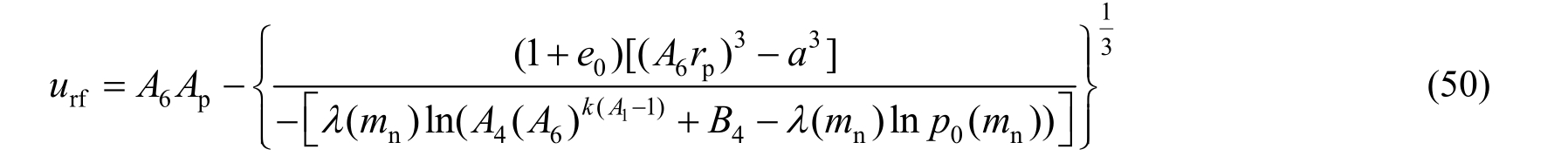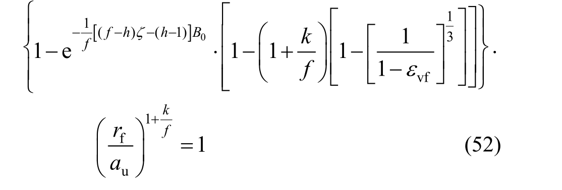 当扩孔达到极限压力,在r=r f处径向应变连续,由式(45)、式(50)联立,忽略u rf /r高阶项,a0/a u→0时,在塑性区与破坏边界上有