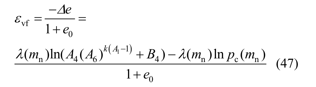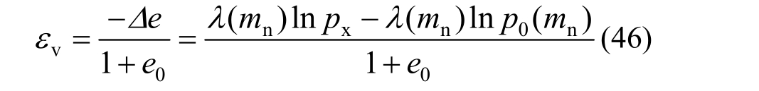 土体进入破坏状态后,如图3所示,结构性土的压缩曲线可以由孔隙比与压缩应力对数值的线性关系描述,λ(m n)为压缩过程斜率,λ与m n关系[17]为 λ=A′ m n +B′ (A′=0.0444,B′=0.0479),p c(m n)为与结构性相关的准先期固结压力。此时土的准先期固结压力和压缩直线段斜率均是结构性参数的关系。压缩体应变可表述为: