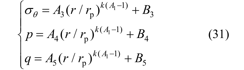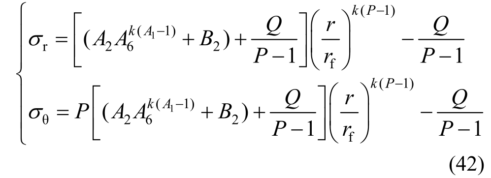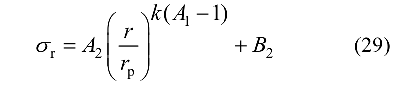 ,偏微分求解得浆液压缩黄土土体破坏区内应力场解答为: