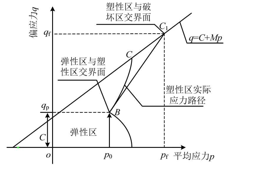 土体内有初始小孔受球形均布压力,当此压力逐渐增加时,球形小孔周围土体将从弹性状态进入塑性状态,经过一系列屈服面后进入破坏状态。如图4所示,在p-q空间,塑性区的应力路径为BC,为了分析方便,以弹塑性交界面上的B点切线BC1予以代替,B点坐标为![]()