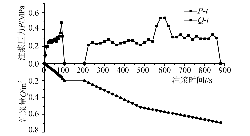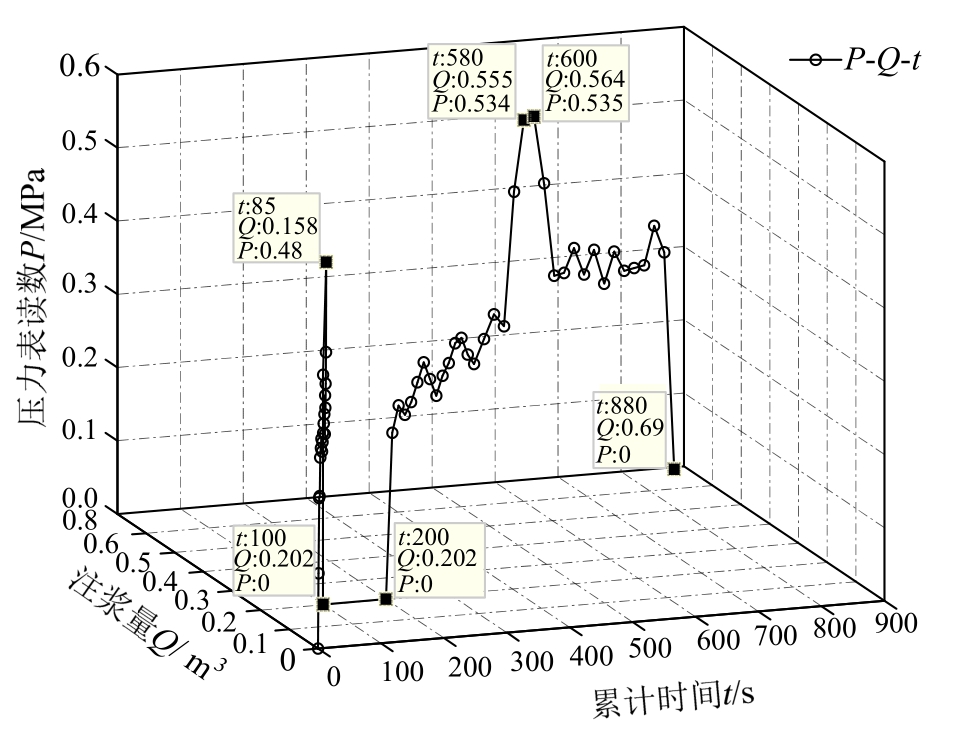 试验过程中将整个试验实施过程用摄像机进行全程追踪,将注浆压力P及注浆量Q随时间t的变化情况绘制成P-Q-t图,如图17所示。