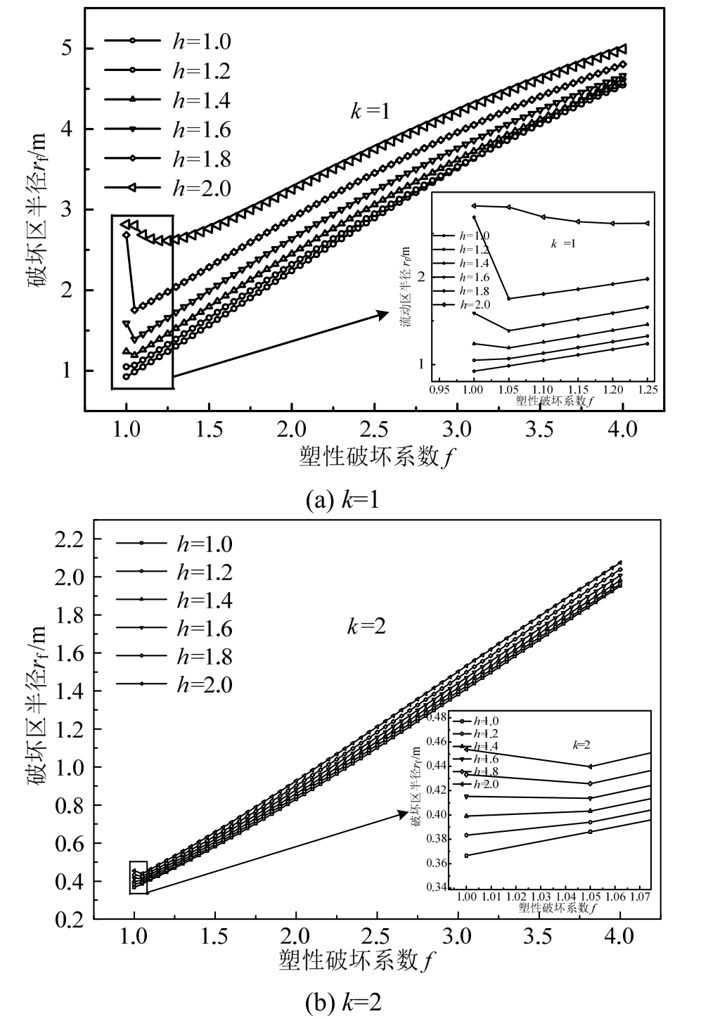 取结构性参数 m n=1,φ=18°,E=5500 kPa,ν=0.35,β=1.8,h=(1~2),f=(1~4),定性分析破坏区半径在剪胀系数h与塑性破坏系数f影响下的变化规律。