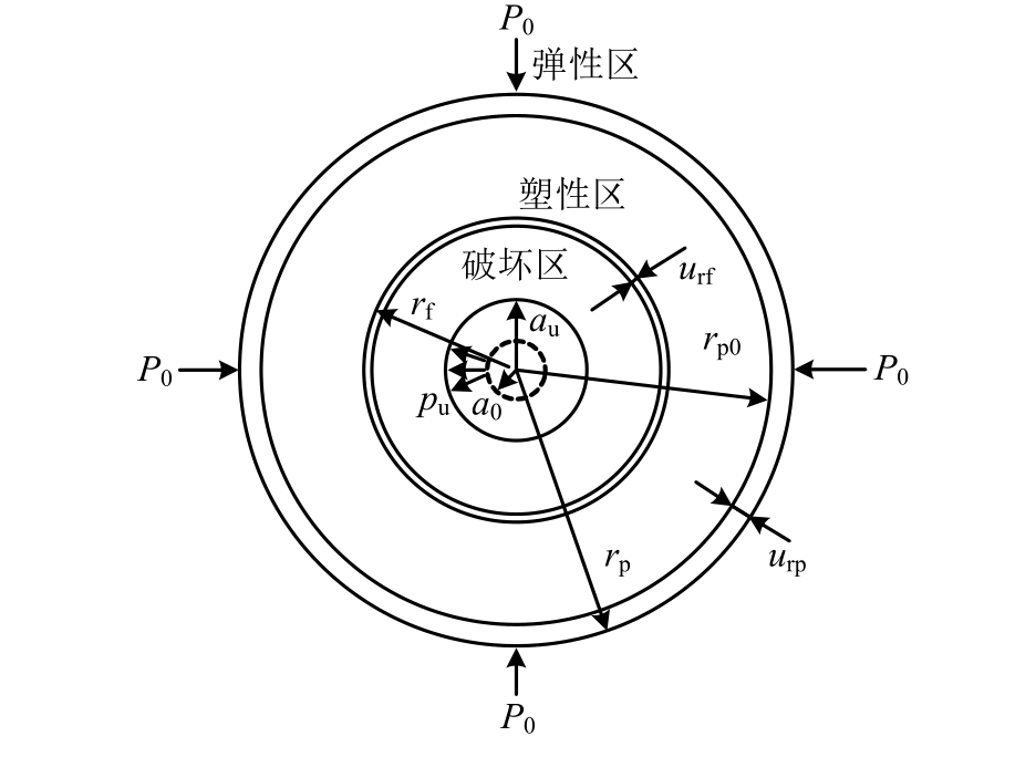 1) 劈裂注浆的起裂与土体抬升阶段可以视为圆孔扩张问题,按照平面应变轴对称解答来处理。为了分析问题方便,将圆孔周围土体的应力分布分为3个区域:破坏区、塑性区和弹性区(如图1所示)。土体初始孔径为a0,初始平均应力为p0,扩孔后,最终扩孔半径为a u,r p为土体弹塑性交界面的半径,r f为塑性区与破坏区交界面半径。r>r p的区域为弹性区,土体处于弹性状态,应力应变服从广义Hooke定律;r f<r<r p表示扩孔后土体的塑性区,土体产生塑性变形,应力应变关系服从结构性黄土修正剑桥模型;a u<r<r f区域为破坏区,土体处于破坏状态,应力路径沿临界状态线CSL运动。