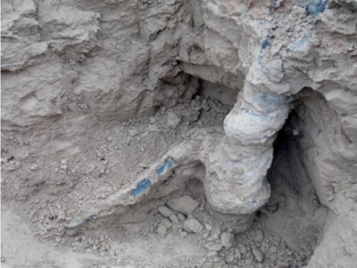 从图 19可以发现,初次注浆过程中注浆压力随时间的变化比较平稳,说明此时注浆形式主要为压密注浆和渗透注浆。注浆过程中压力出现了几次较小的峰值,初步判断可能是土体小范围劈裂。二次注浆过程中,压力上下波动比较剧烈,可能的原因为土体裂纹尖端能量的聚集与释放交替进行。压力较初次注浆时明显增大。随着劈裂的持续进行,裂缝不断向前拓展,靠近二次劈裂结束位置时,压力骤减,说明裂缝尖端的能量已不足以再使得裂缝拓展。当裂缝不再拓展时,压力缓慢降低,此时主要以挤密土体、巩固裂缝为主,直至注浆结束为止。在整个黄土注浆过程中,注浆机理主要以劈裂为主渗透压密为辅,出现了三次较为剧烈的压力峰值和一次较为平稳的压力峰值,表明土体中出现了范围较大的劈裂注浆现象。对注浆管附近土体进行开挖(图20),土体形成较大范围的浆脉,扩散距离较远。说明在反向增压注浆管的作用下压力可以集中释放,形成的高应力促使土体主要以劈裂注浆为主。