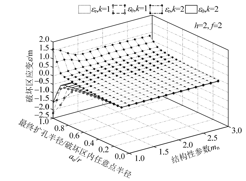 图12 表示破坏区应变与参数m n及a u/r的关系,从图中可以看出,a u/r对破坏区应变影响较m n显著。当参数 m n一定时,应变随 a u/r的增大而增大;参数a u/r一定时,随m n的增大而减小,且m n≥1.3后,产生的应变将很小。整体来说,在m n及a u/r的共同作用下,二者对环向应变的影响较径向应变显著。
