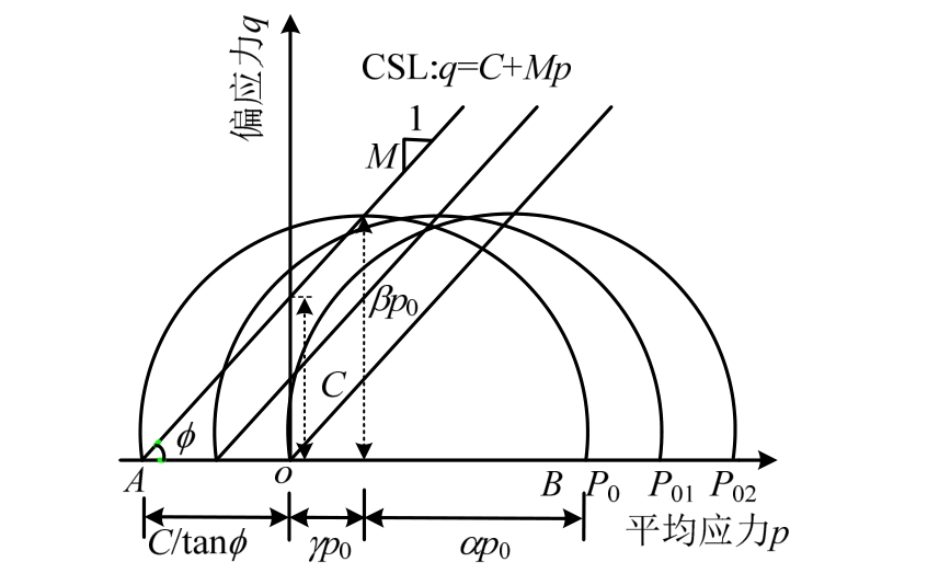 从式(20)可以发现,最后一项是由于考虑结构性致使CSL不通过原点,式(5)中,当m n=1时,c=0,上式就退化为修正剑桥模型,则说明修正剑桥模型屈服面是结构性剑桥模型的一种特殊形式。